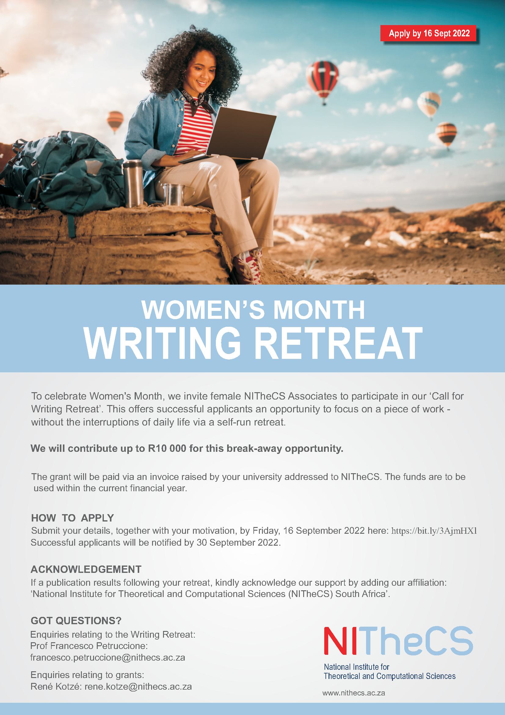 To celebrate Women’s Month, we invite female NITheCS Associates to participate in our ‘Call for Writing Retreat’. This offers successful applicants an opportunity to focus on a piece of work – without the interruptions of daily life via a self-run retreat. We will contribute up to R10 000 for this break-away opportunity.